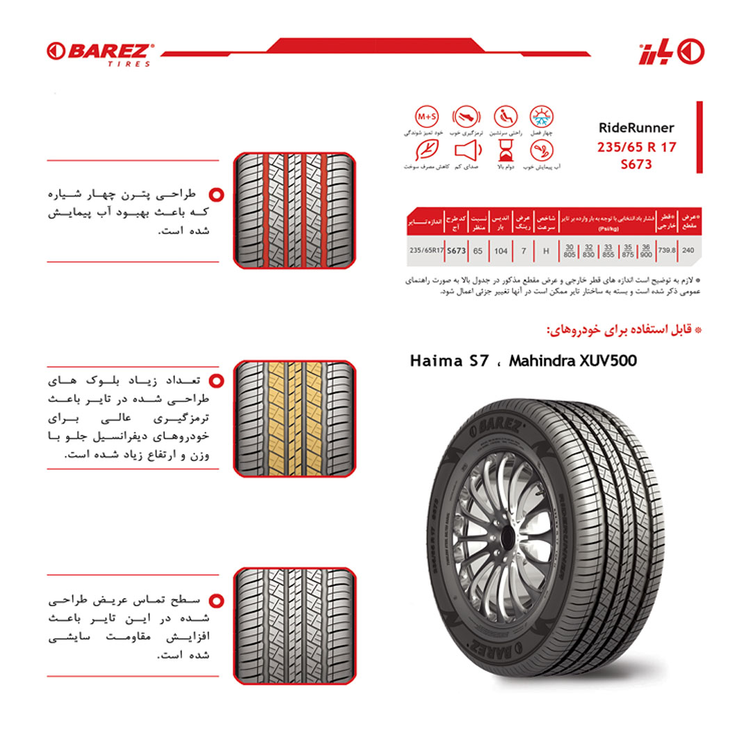 لاستیک بارز 235/65R17 گل BAREZ S673 درجه1 (دو حلقه)
